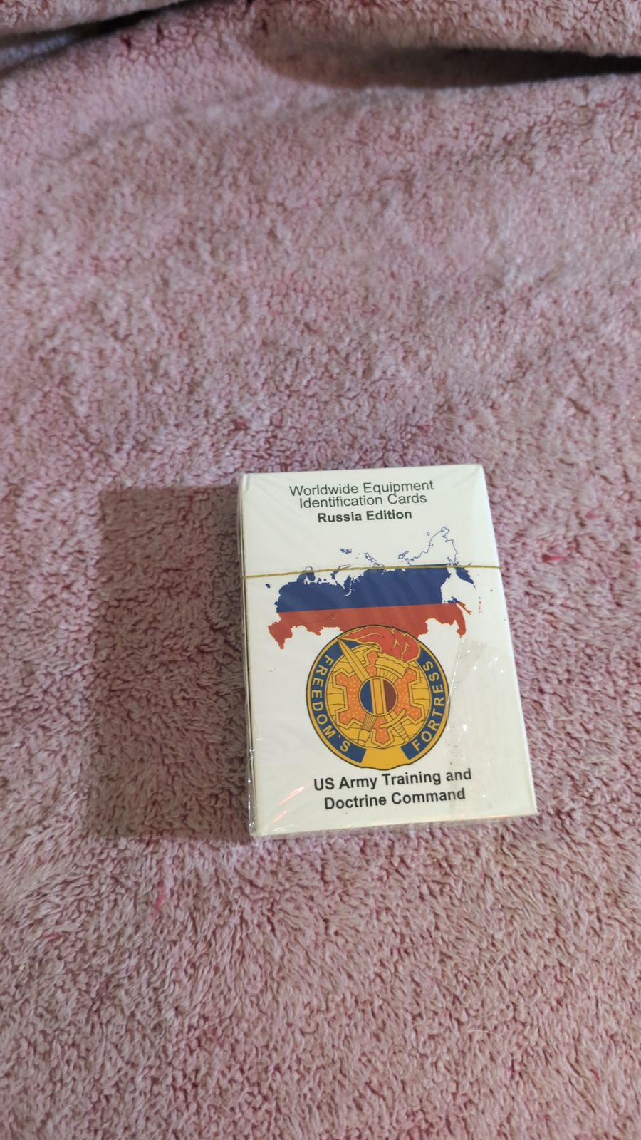 As described, playing cards with Russian equipment. Would love a Naval edition with all the Russian fleet ships and aircraft on them, for research purposes of course.