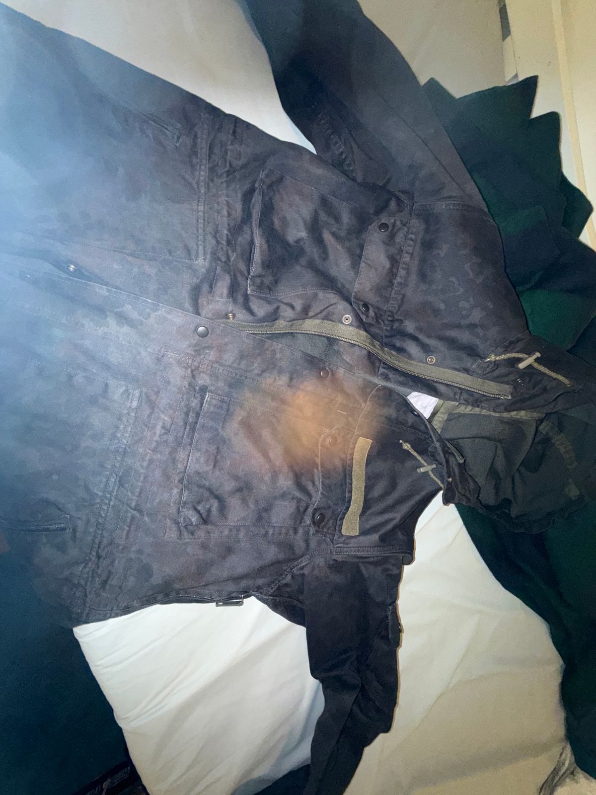 Our process takes the iconic Flecktarn pattern and 'scorches' it with a reactive dye, darkening the print and giving each piece a unique appearance. Black, but not quite black — the color of the fabric shifts in the light.