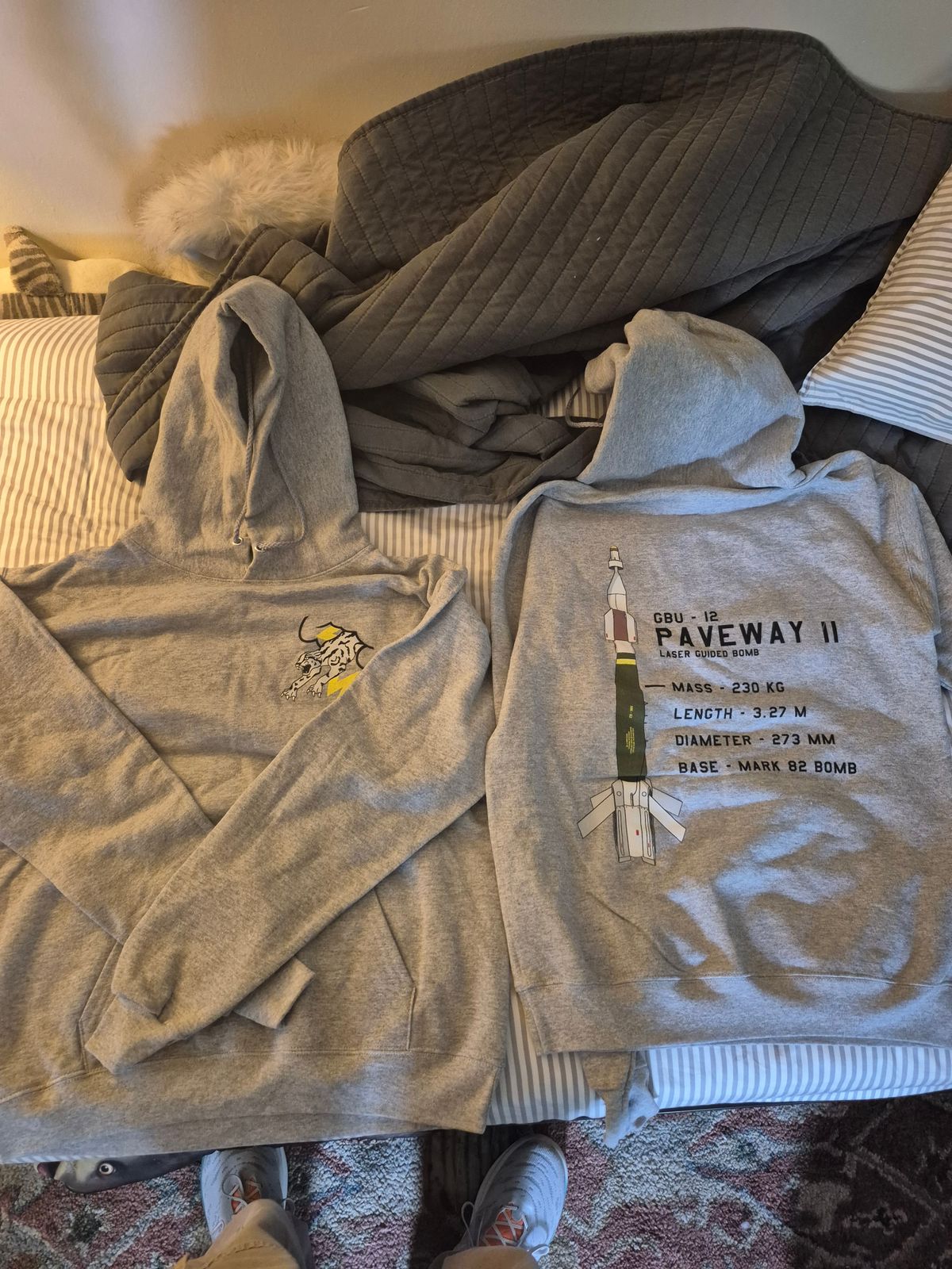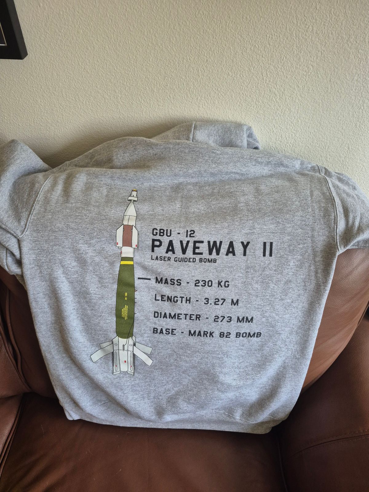 The good news is, it still looks freakin' awesome. For well-adjusted fans of military aviation, you'll be able to sport an ultra-comfy hoodie with a highly detailed illustration of the GBU-12 Paveway II laser guided bomb printed on back, and a squadron logo on the front.