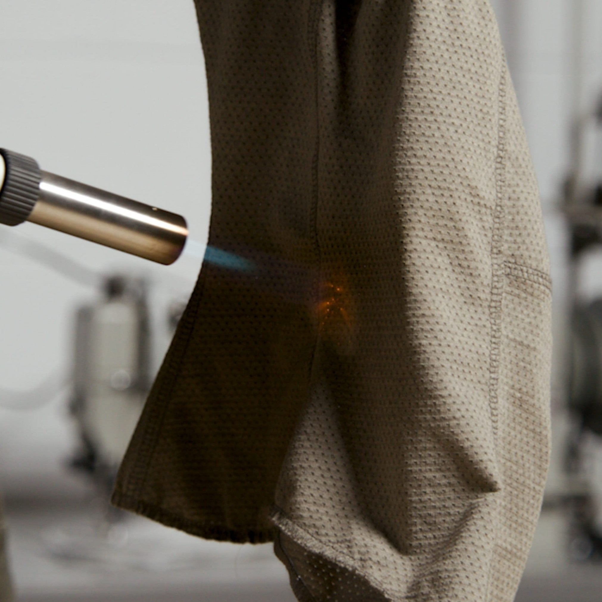 Inherently FR materials are far better at doing their job — They have a very high heat resistance, and most importantly, "self-extinguish" under high heat and even direct contact with flames. The material takes the damage and safely smoldering away to avoid harming anything that's underneath it, like your skin.