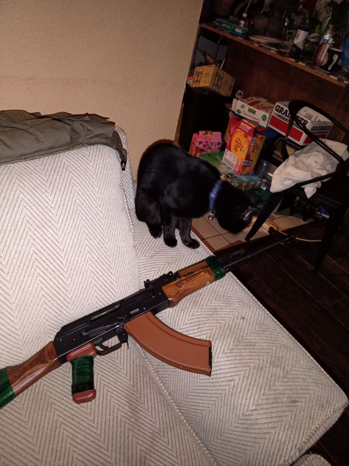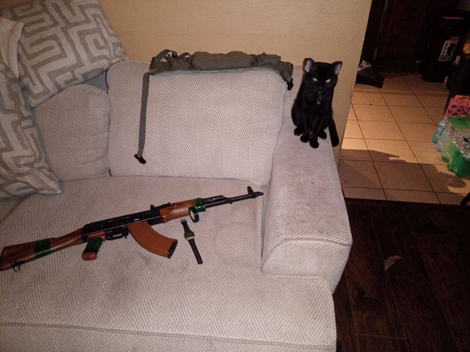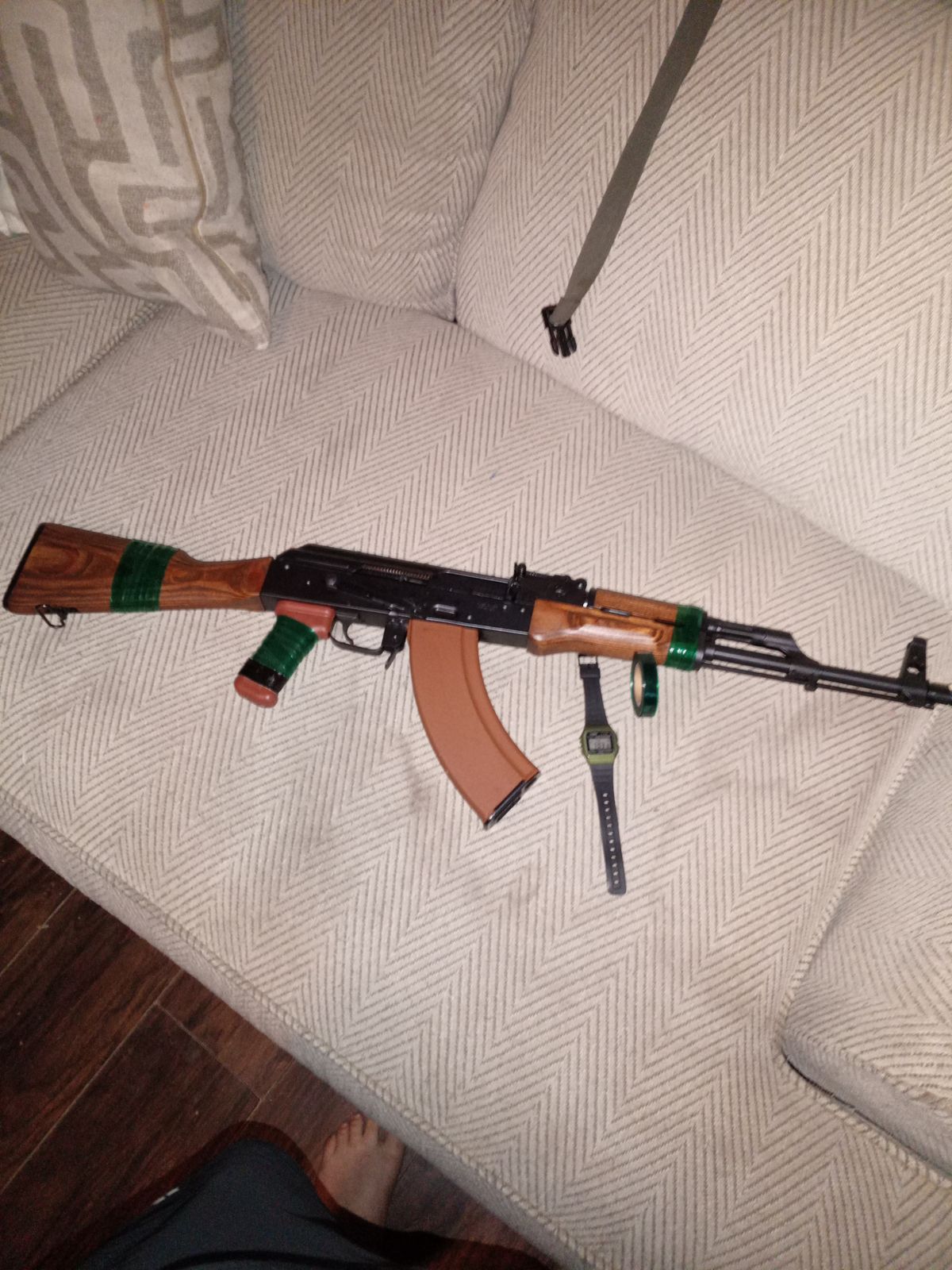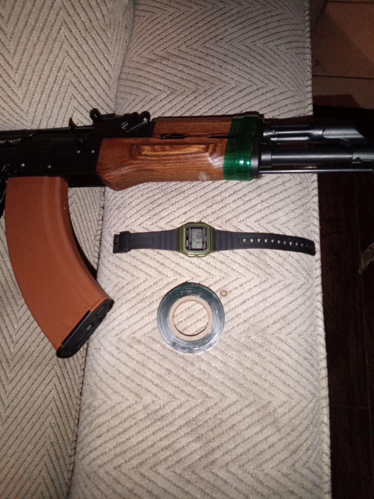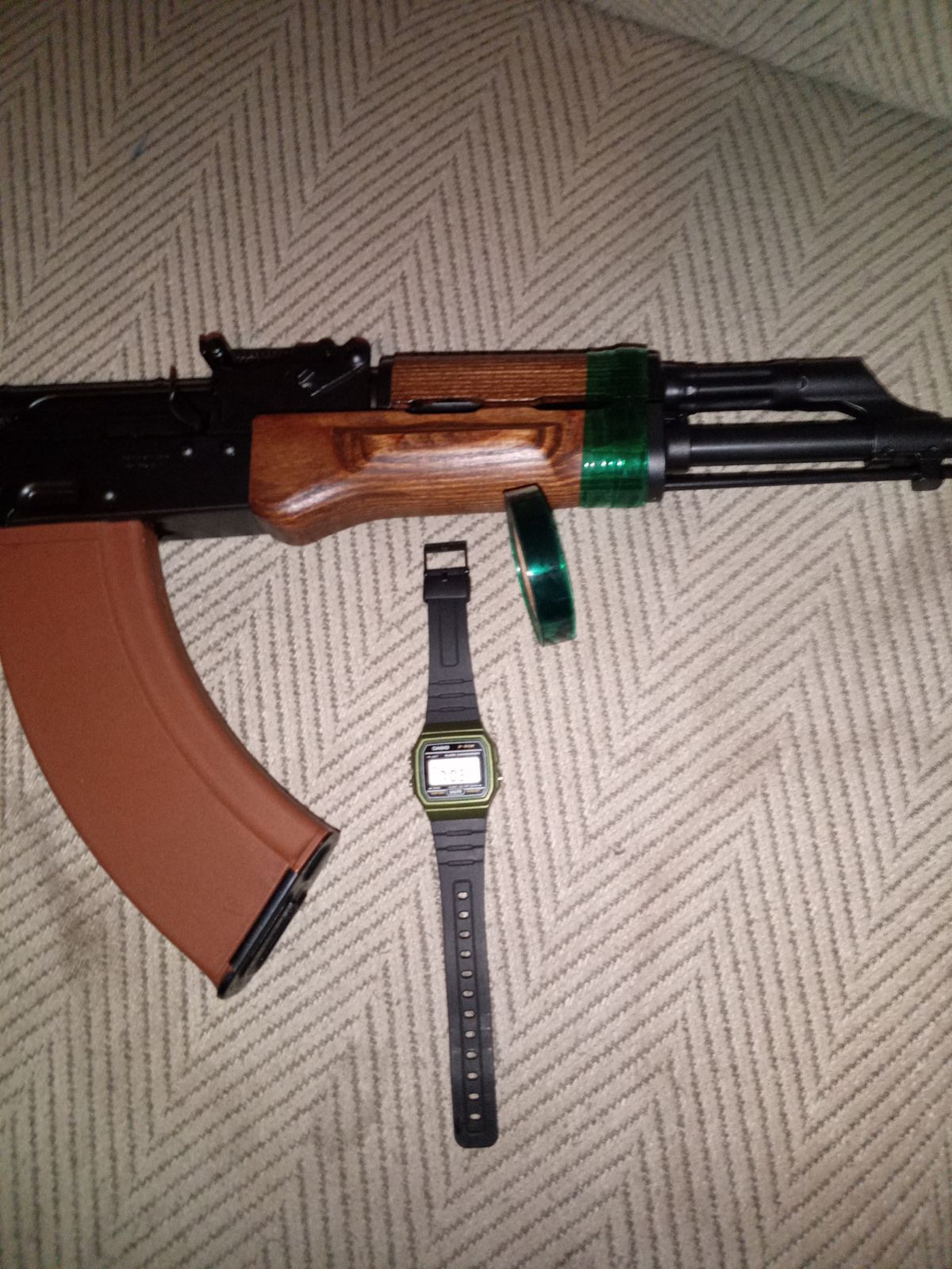 Good grip tape , and the family cat who's name is Draco loves it!! I have my ak just in my living room to do some work on it , he just comes and looks and admires the color. I put my Casio F91W next too the roll for size comparison I wish it was at least an inch it's a little skinny, but there's a decent amount . I put some of the tape on my polish pioneer arms Sporter fits the bad guy look.