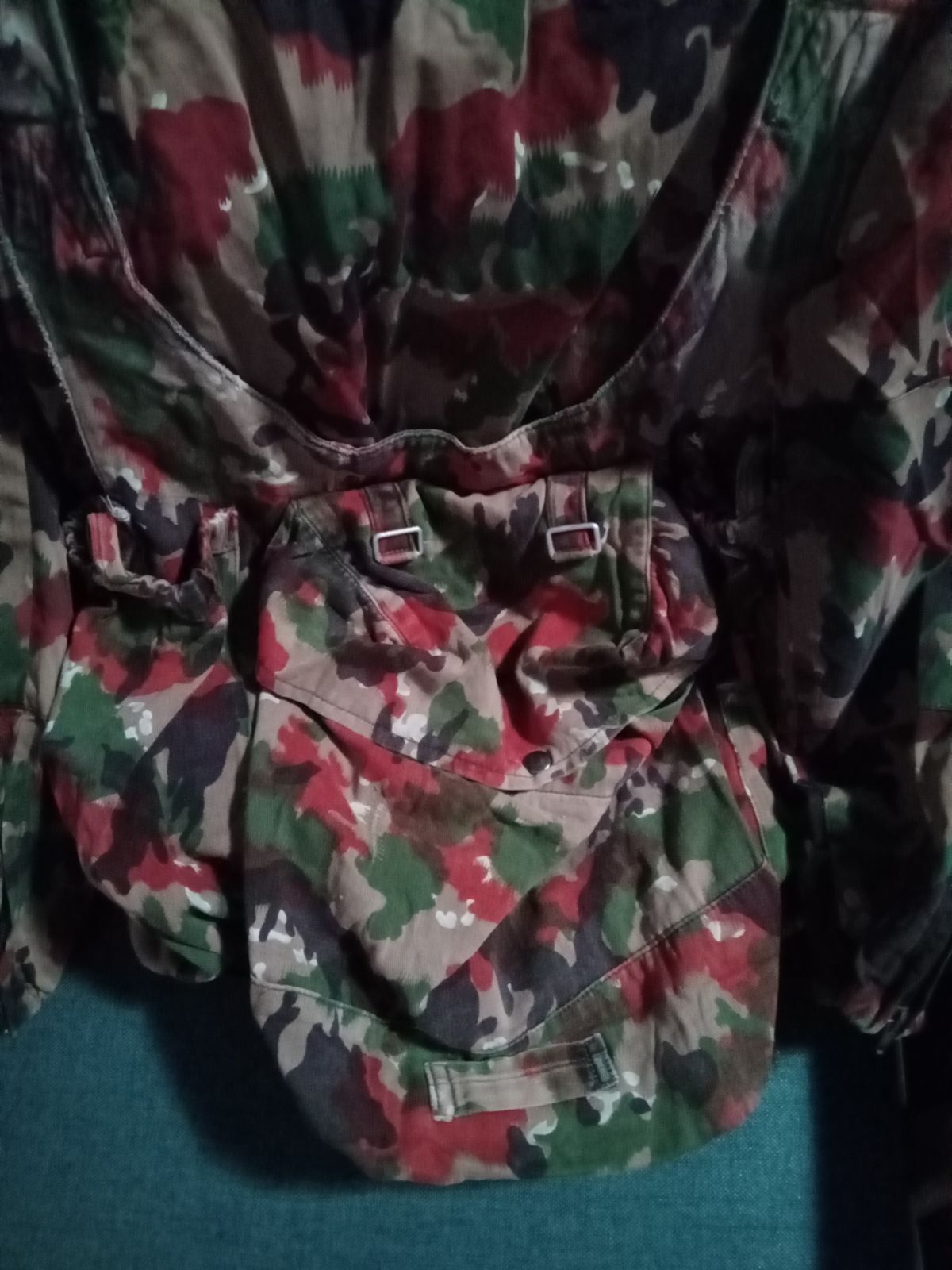 Attaching to the shoulders and hips of the parka, it adds even more space to the absurd capacity the parka already sports. it features two cinch-shut side pockets originally designed for rockets or mortar shells, and a main pouch with a simple snap closure for MREs, A mess kit, rain poncho, anything you'd not need but probably want with you on a short assault. It also has a way to attach an e-tool with a retention loop at the base of the main pouch to keep the handle retained.
