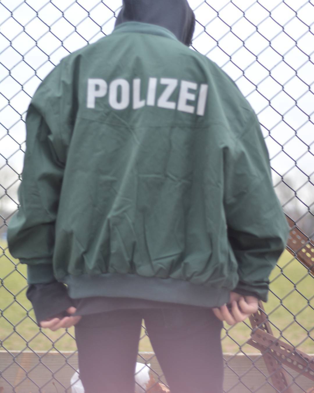 Modeled after the American MA-1, the Sommerblouson is a forest green bomber jacket emblazoned with reflective “POLIZEI” lettering across the center back. As a garment, it is simple, well-constructed, and slightly oversized—occupying the same practical “anti-fashion” space that defines Dickies and Carhartt.