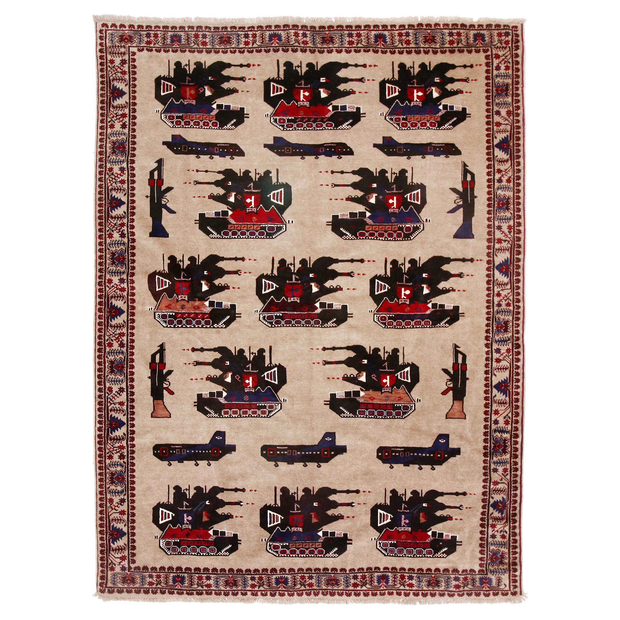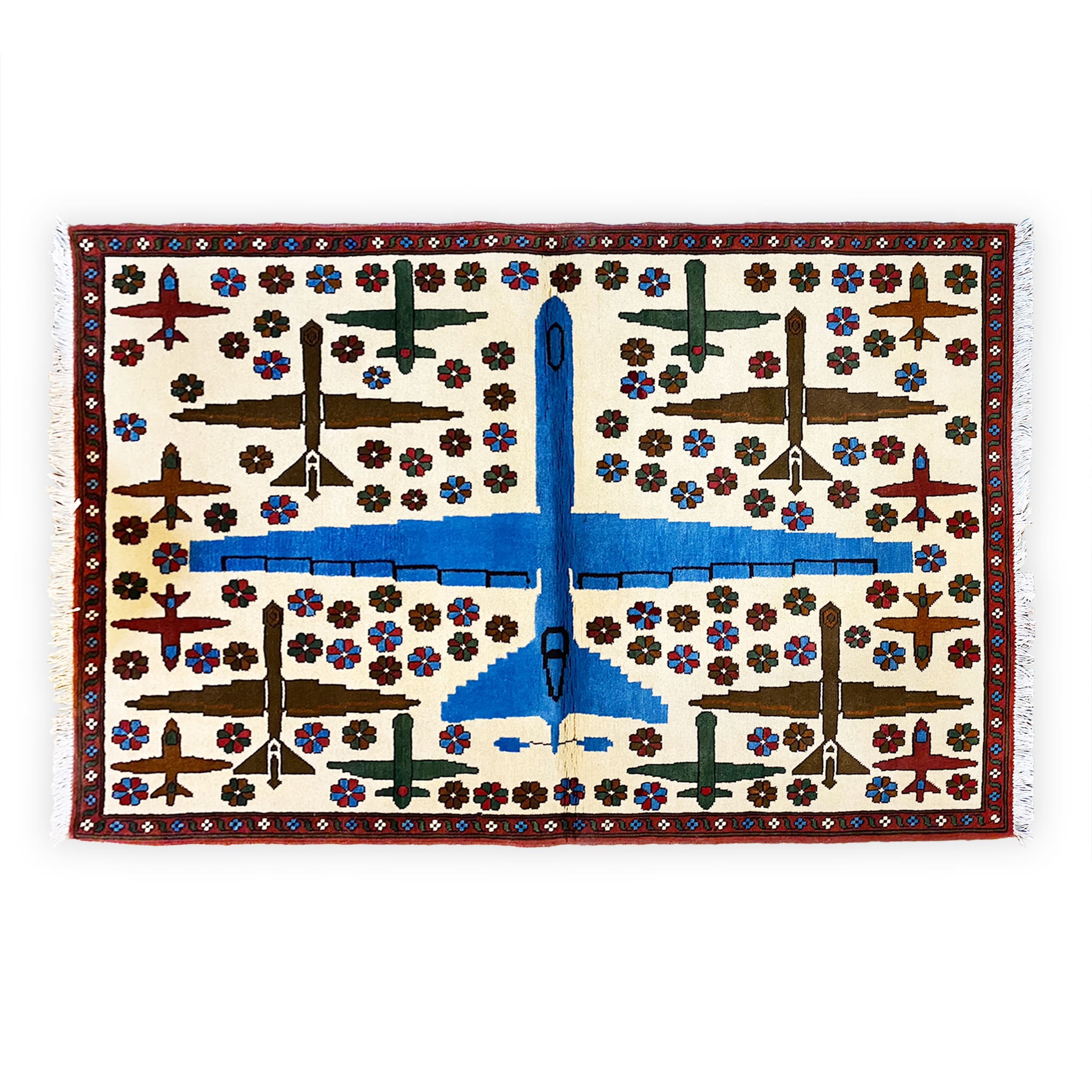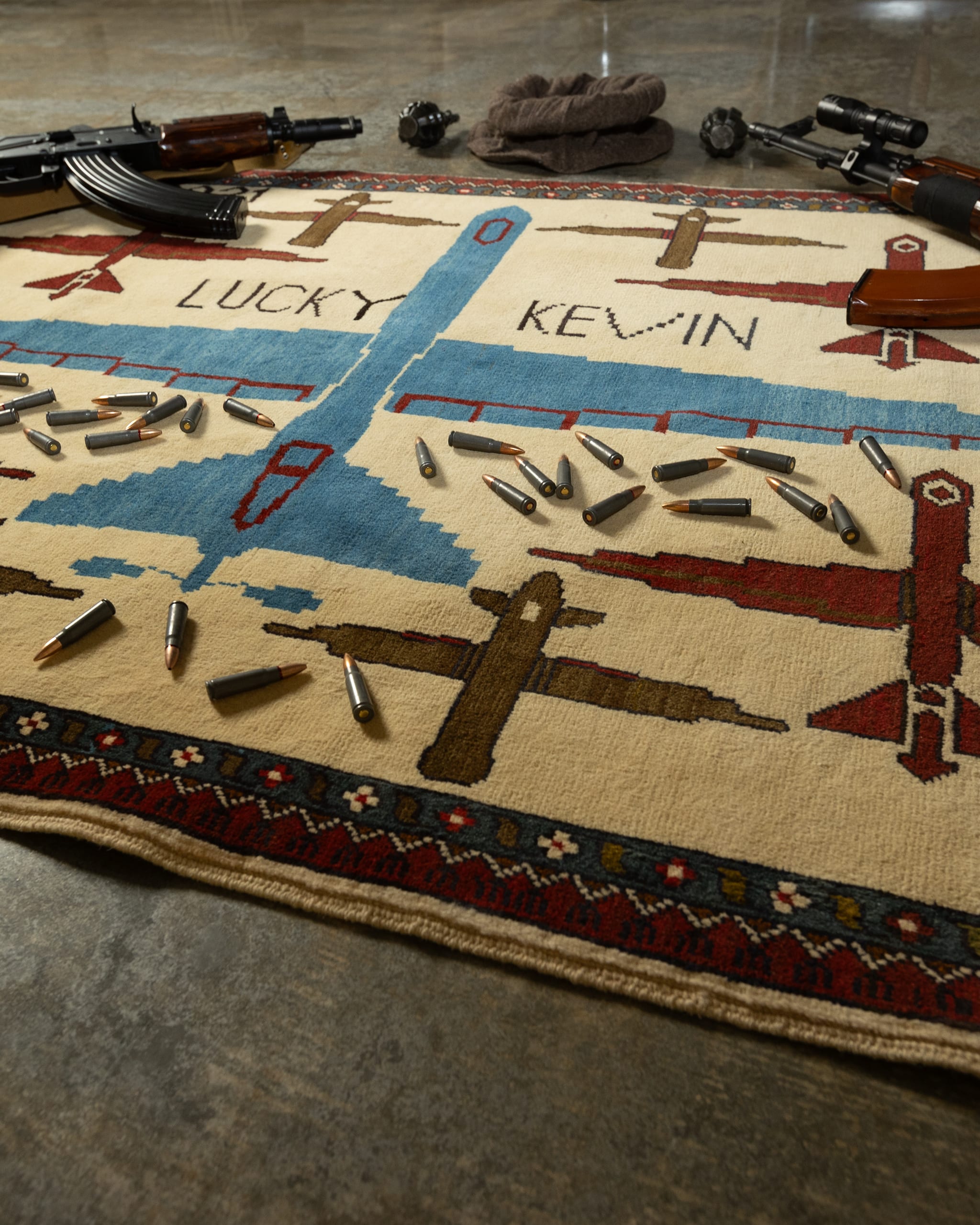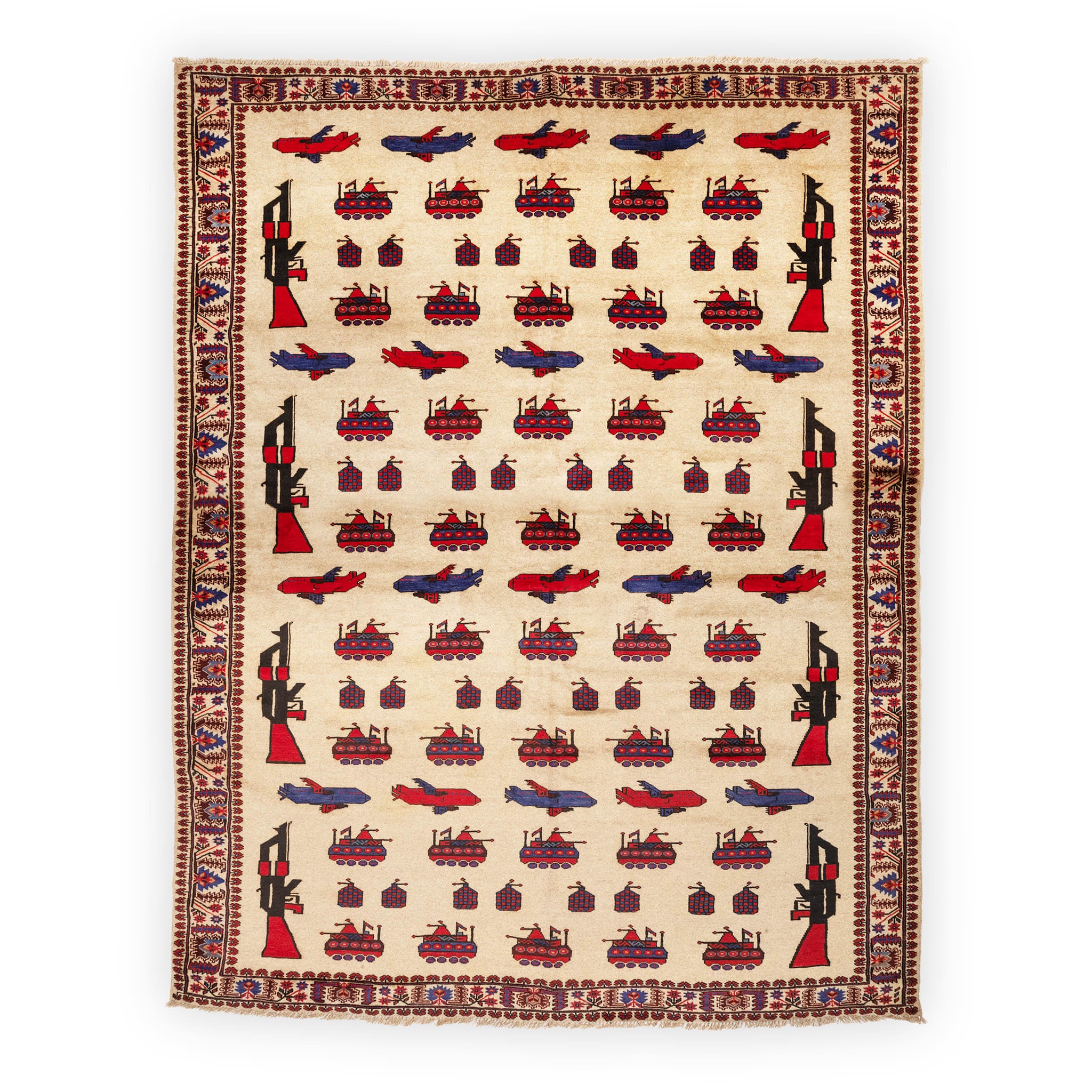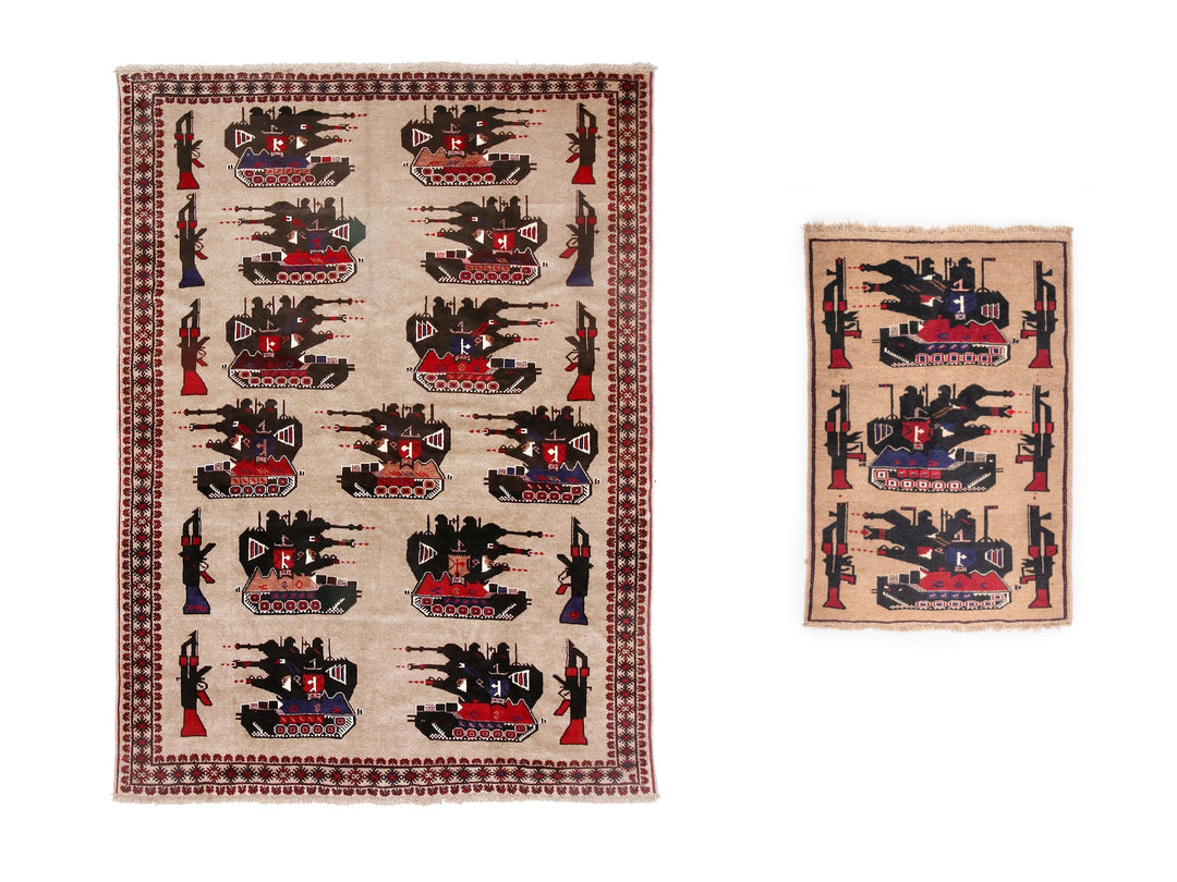 This very large pattern rug features lines of grenades, tanks, transport planes, and Kalashnikovs. For size reference, the AKs are identical in size on all of the rugs.
