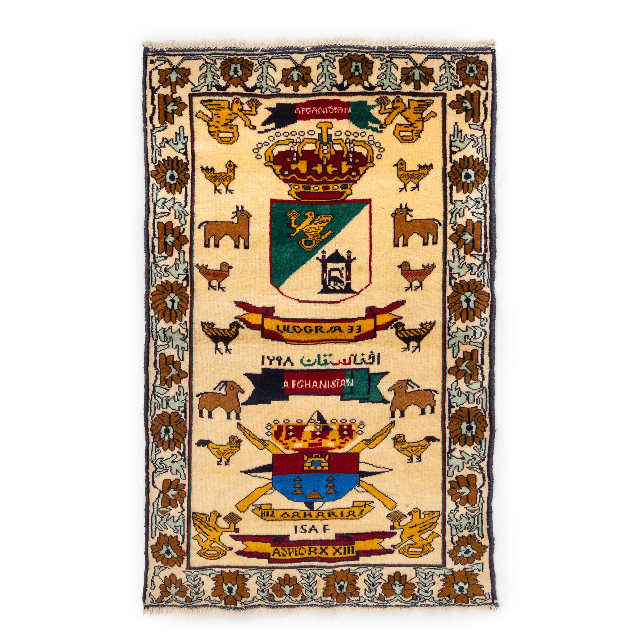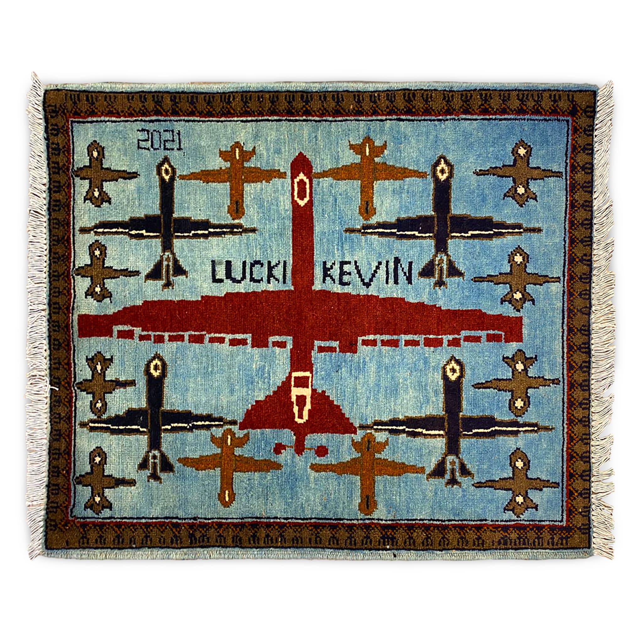 An obvious misspelling of soldiers, this rug depicts the US invasion of Afghanistan with air power. F16 Fighter jets, chinook helicopters, Drones, and B-52s are seen among other small arms. The notable features are the phrases "AFGHANS LIBERATED FROM TERRORISTS" and "LONG LIVE US SOLOIERS" as well as 'PENTAGON' and 'WTC'.