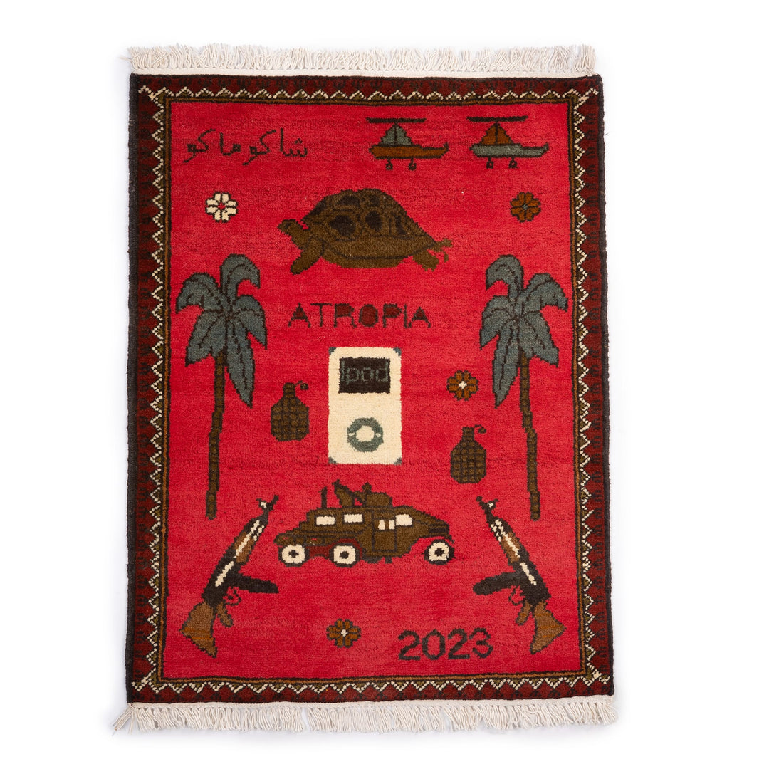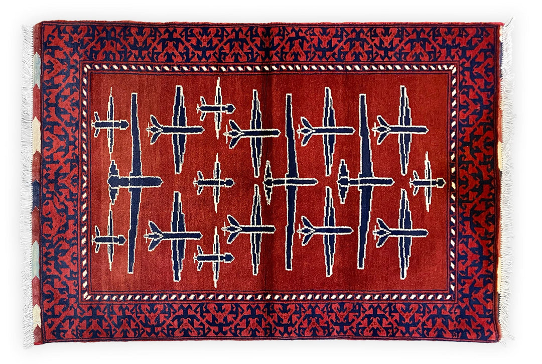 One of the only designs depicting events to take place outside of Afghanistan. A Russian and Ukranian flag are shown in the center with various NATO and Russian weaponry scattered around the rug.