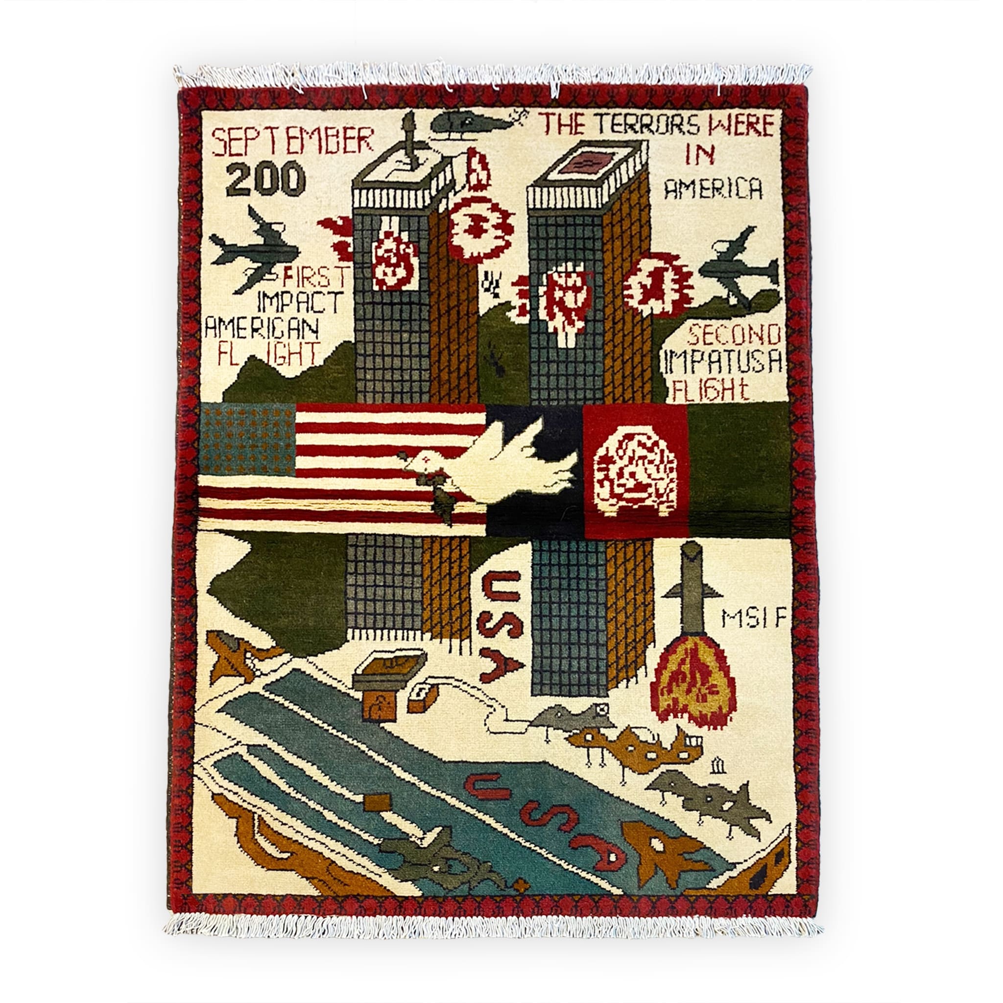 On the original design, this was meant to be 'September 2001', when the attacks happened. However, some weavers mistake this area as a "Made in 20XX" and will put the date of weaving here. We've seen rugs that depict 9/11 as happening in 2021...