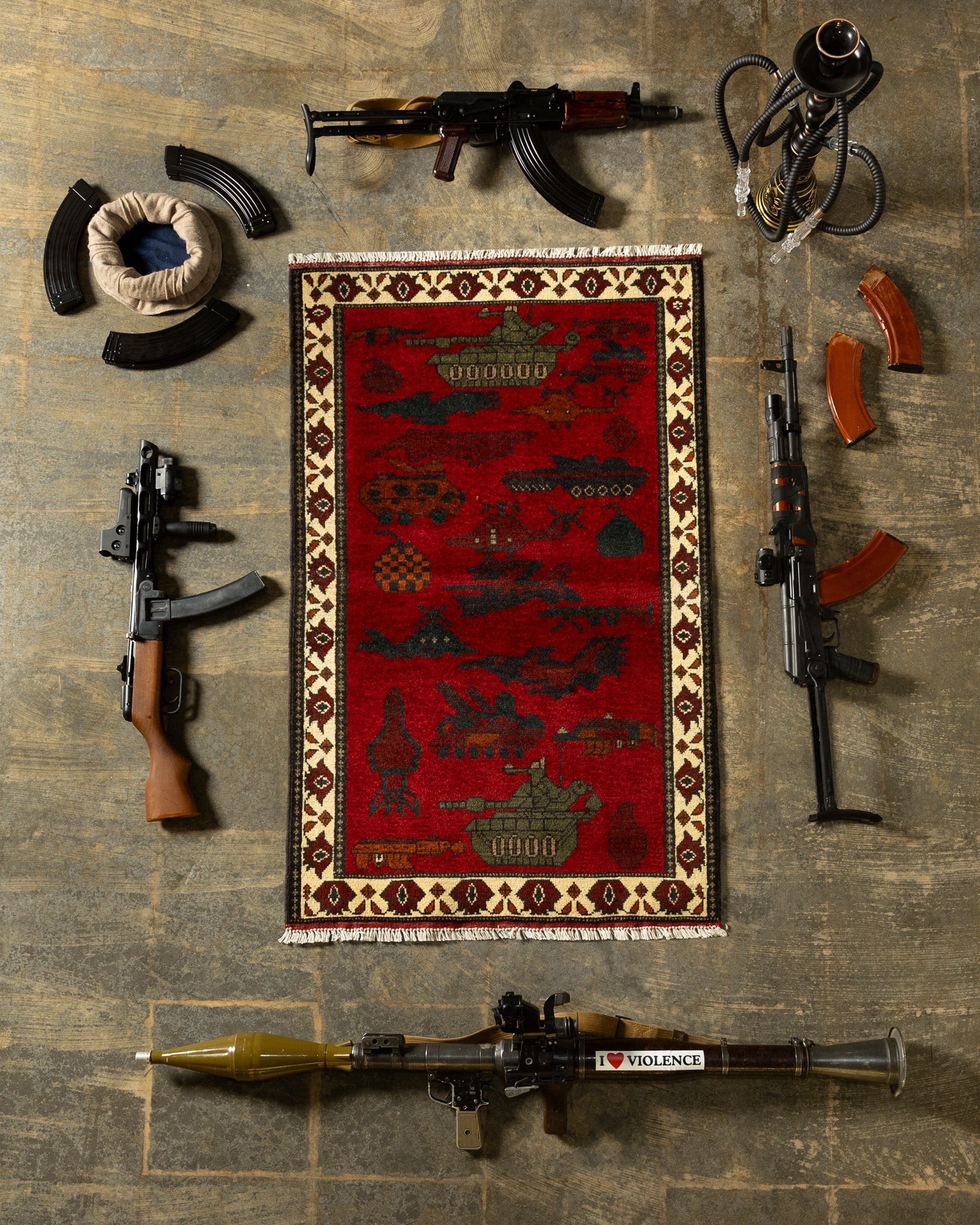 An alternate '4 AK' pattern with the words "death of Russia" can also be found, most likely alluding to the fall of the Soviet Union and the end of soviet occupation of Afghanistan. Helicopters, RPGs, grenades, and tanks fill the empty space of the rug with additional smaller munitions seen.
