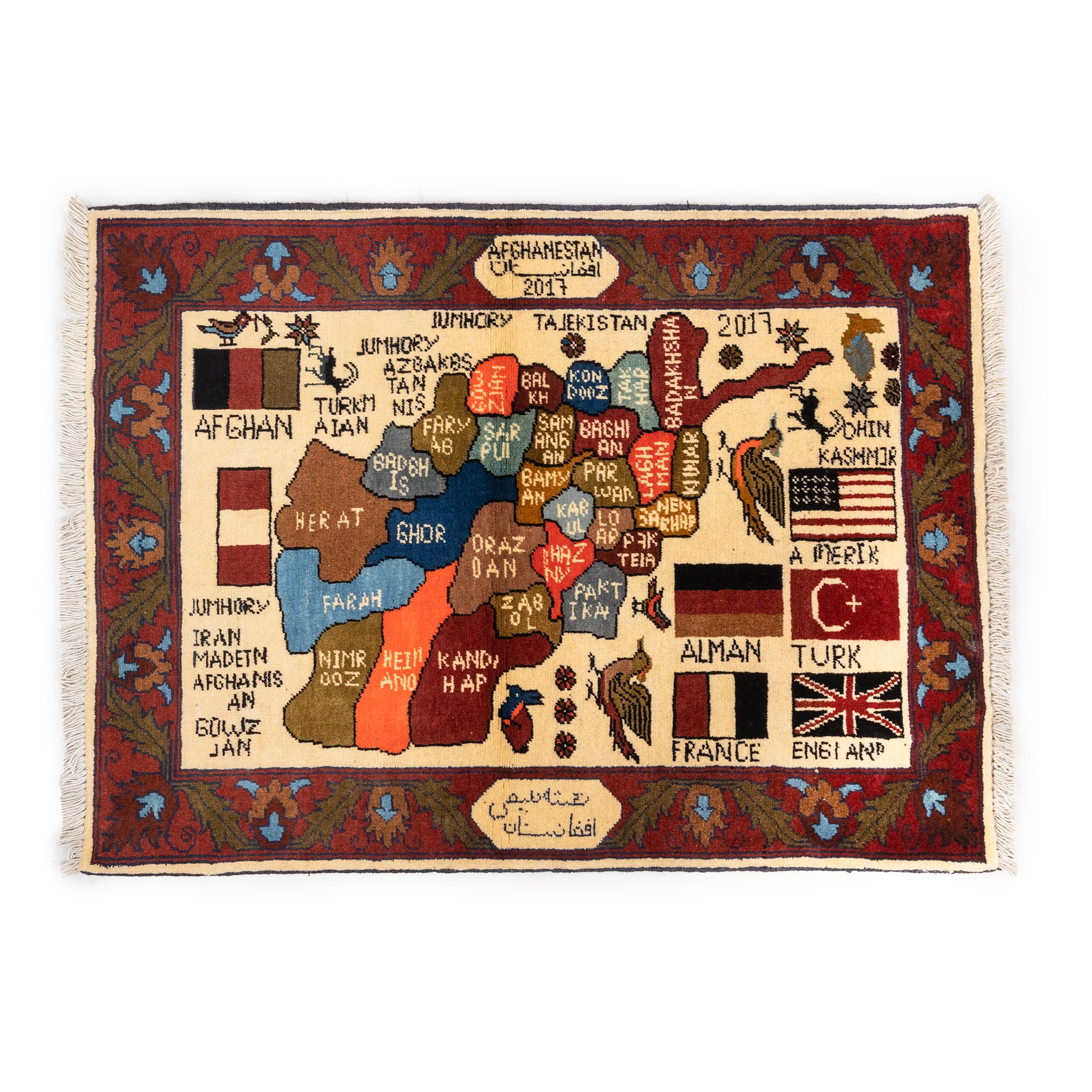 A map showing the various reigons of afghanistan, with sometimes readable labels of neighboring countries, notably the outdated "USSR" dating back to Soviet occupation. This design iterates off of world-famous map-rug designs that have long been an Afghan staple.