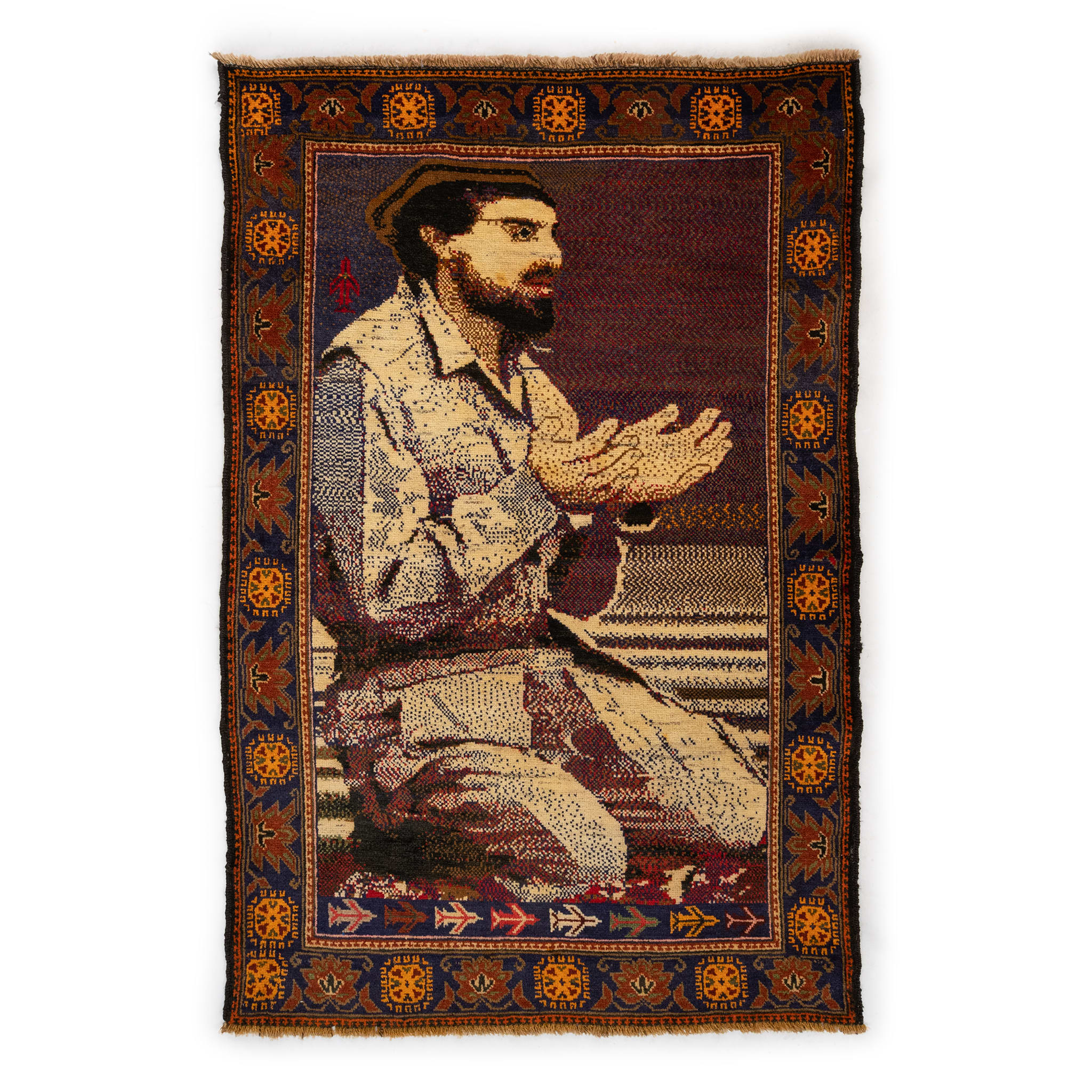 An extremely prominent figure of the struggle against the Taliban from the mid-80s through the 90s, Massoud is seen on countless rugs. It was very common to see prominent religious & military leaders woven onto rugs as a form of propaganda.
