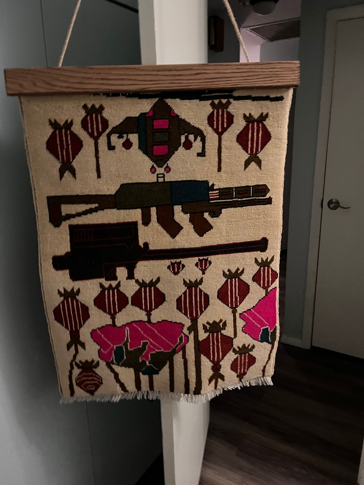 These rug designs feature the same general idea: soviet tank columns moving into Afghanistan and the small arms & vehicles that also came with them. The Soviet-Afghan war was one of the first major cases where the Kalashnikovs and tanks really started appearing on rugs. The maps depicted drew inspiration from Italian rug-artist Alighiero Boetti's famous world map rugs, which were coincidentally made by Afghan weavers.