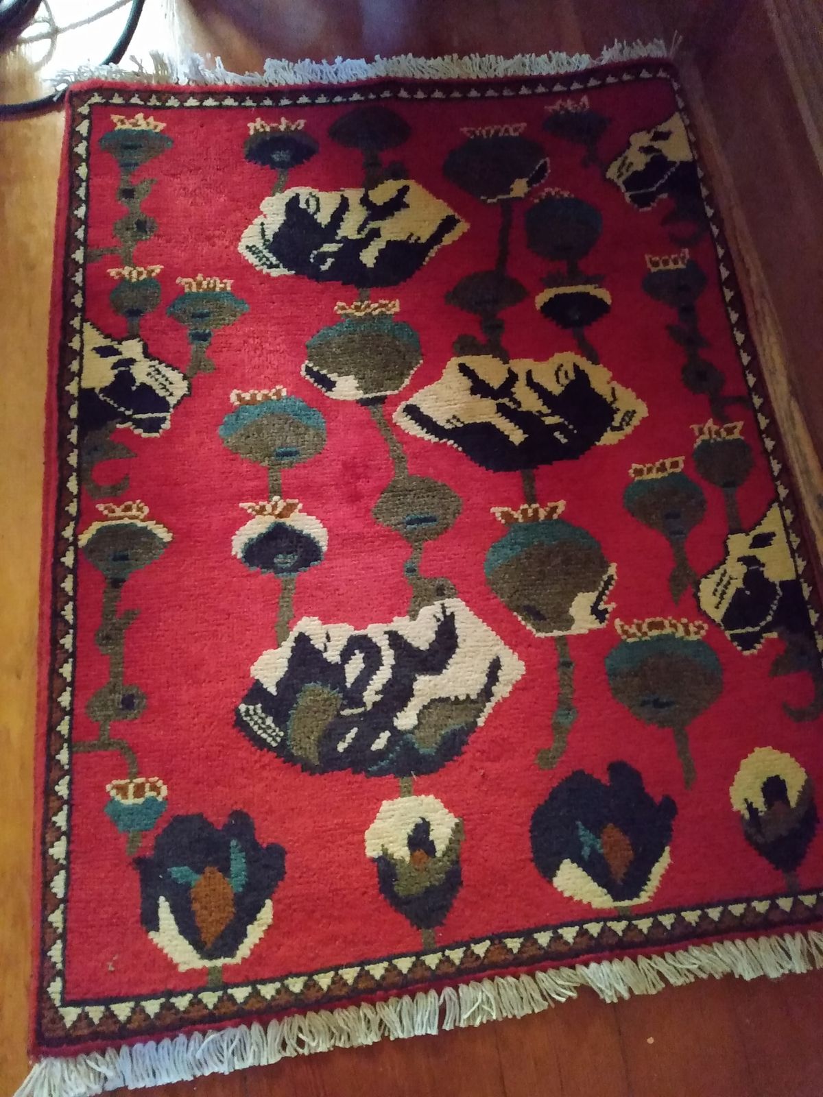If you want to be less crude about things, please contact a professional rug cleaning service specializing in artistic rugs (not carpet cleaners). The hand-woven construction and natural dyes used in these war rugs require special products and techniques to clean without permanent damage.