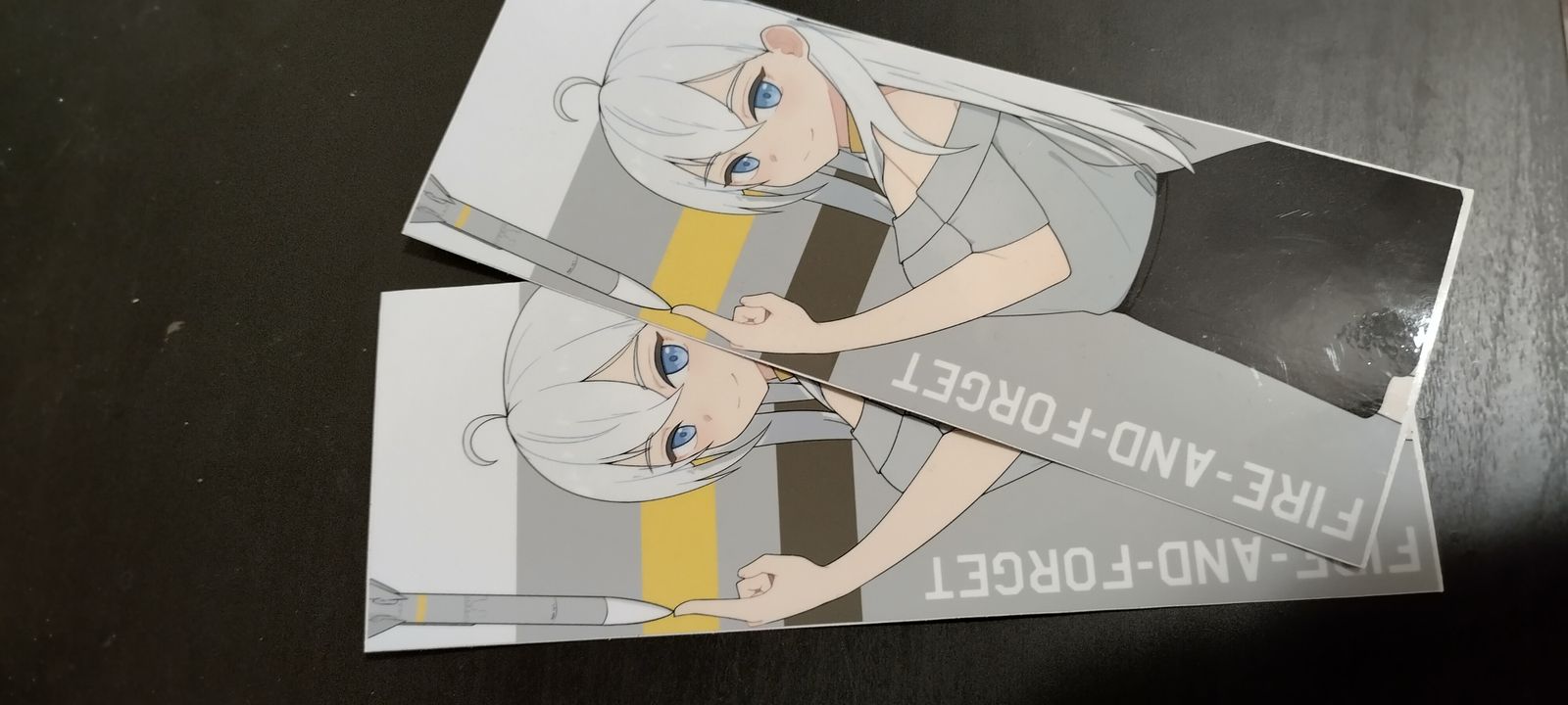 Our bundle also includes an 8 x 3" slap of AMRAAM-Chan, and an embroidered pentagonal 3" round patch—both original, never-before-seen designs.