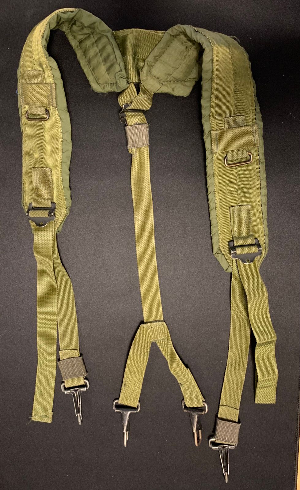 It features padded shoulders, a 4 point harness that clips in to the metal loops on an ALICE LC-1,2, or 3 belt, and has areas to clip a flashlight & other small pouches on to the shoulder.
