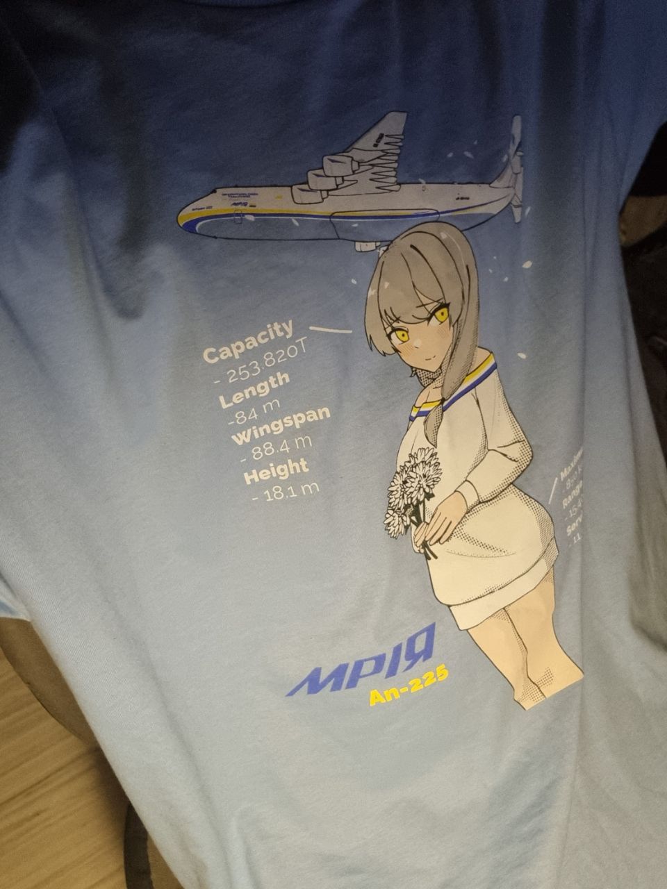 In our latest collaboration with renowned aviation-waifu artist Atamonica, we're pleased to bring you the most adorable way to carry over 200 tons of cargo through the air. This shirt is an extra-fine, double-sided screen print of An-225 Mriya-chan. Using high quality inks and our favorite US based print shop, we're able to achieve an incredible level of detail, color, and quality. And unlike cheaper 'direct-to-garment' printing methods, our screen print will stand the test of time.