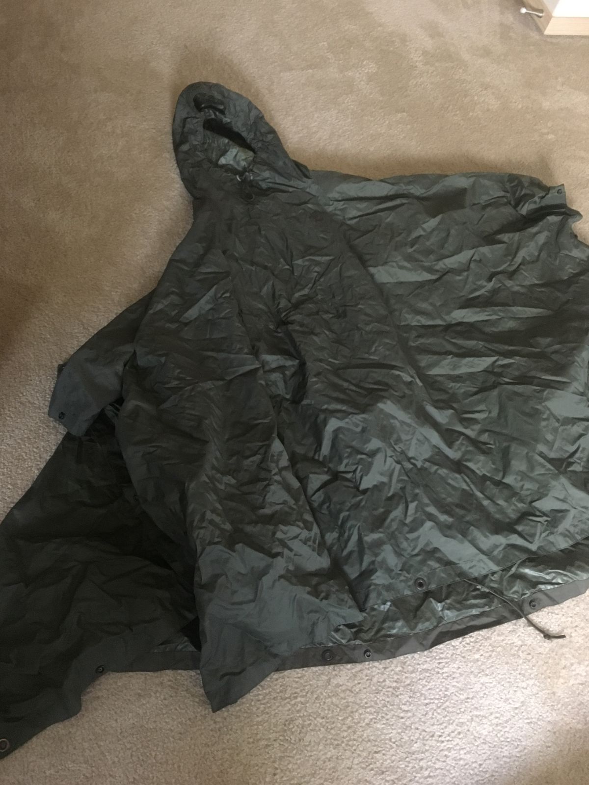 Looks great, fits great, super durable, lightweight. Great for stowing in a pack for heading innawoods. However, as received, the interior waterproof membrane of the nylon is a bit aged it could not stand up to any rain harder than a light shower. During a regular outing I rapidly found that I was wearing a wet tarp in a downpour. Picked up some nylon sail waterproofing and liberally doused the sucker. Works great now, with periodic reapplication.