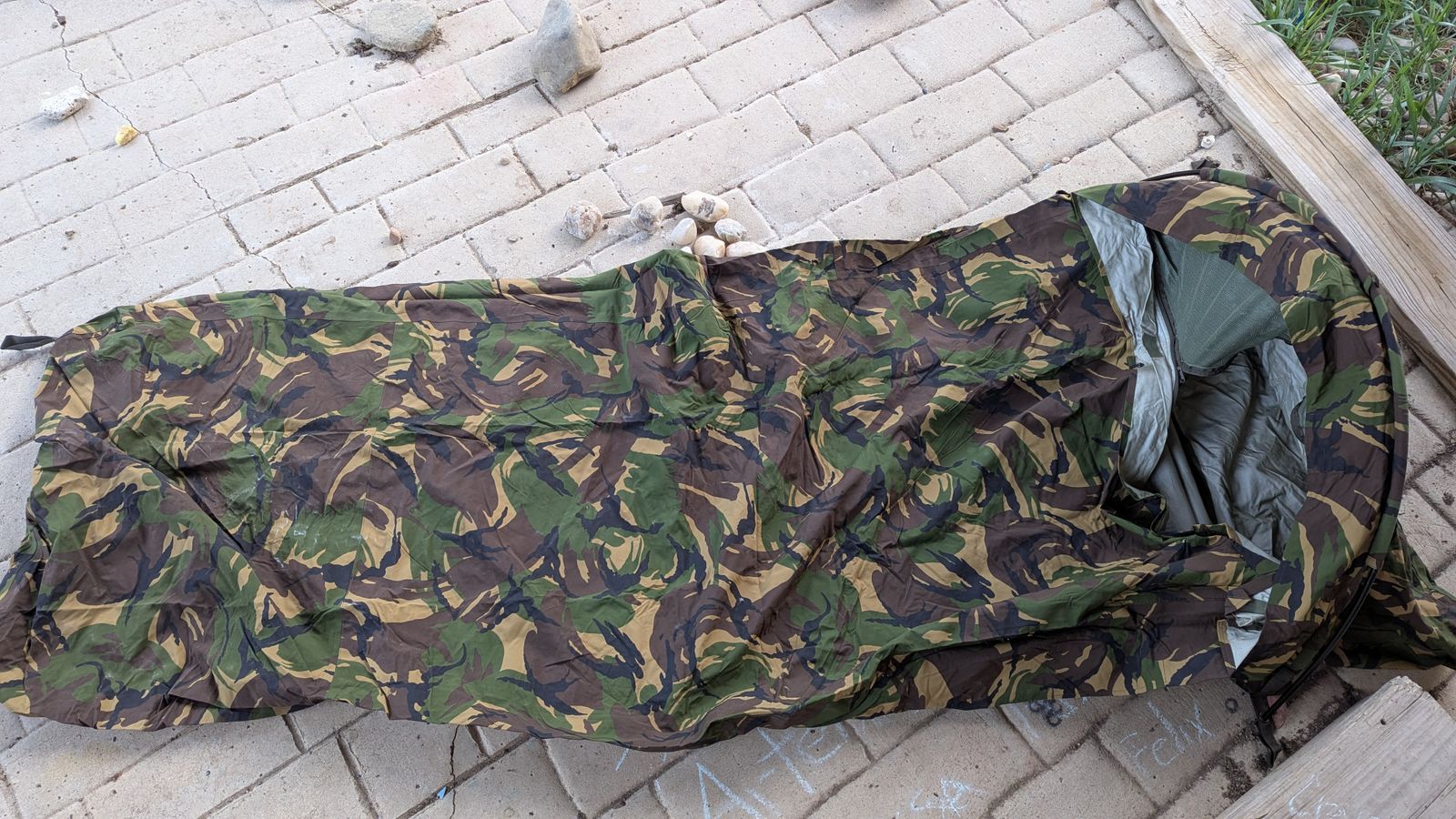 Curiously, you'll find large bands on the outside bottom of the bivy cover — apparently the Dutch believe that a sleeping pad should not only have a way to be secured to the bivy but have it be on the outside. Your guess is as good as ours.