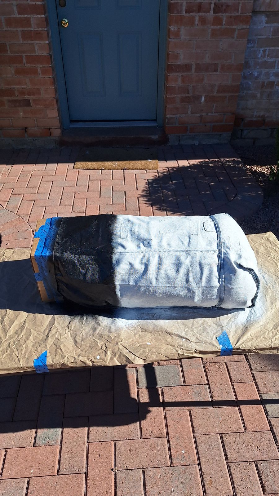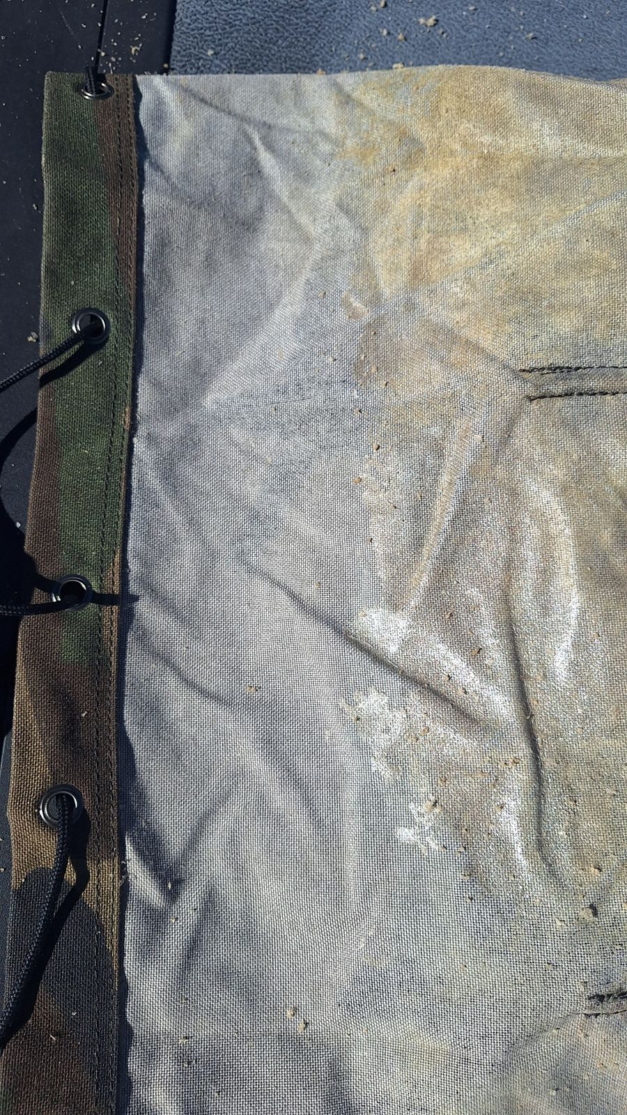 Now for the elbow grease. The PU coating on the inside of the bag was FUBAR. The inside was covered in sticky, stinky, little granules of the coating. I went out, bought a stiff brush and some flex seal, and got to work. I flipped it inside out and took about an hour to brush most of the coating off (pic 1 is about 5 min of work). From there I stuffed it, taped it off, and gave it a light coat of flex seal (pic 2). I'm currently waiting for the flex seal to fully cure but this bag now has a whole second life to live.