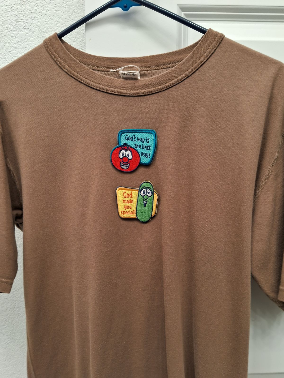 Great quality shirt. Hardy cotton/poly blend that balances weight and comfort well. Two stitched in hook & loop tabs for you to stick patches onto. I like mixing it up depending on where I'm headed. Bob & Larry from VeggieTales approve. Remember, God made you special!