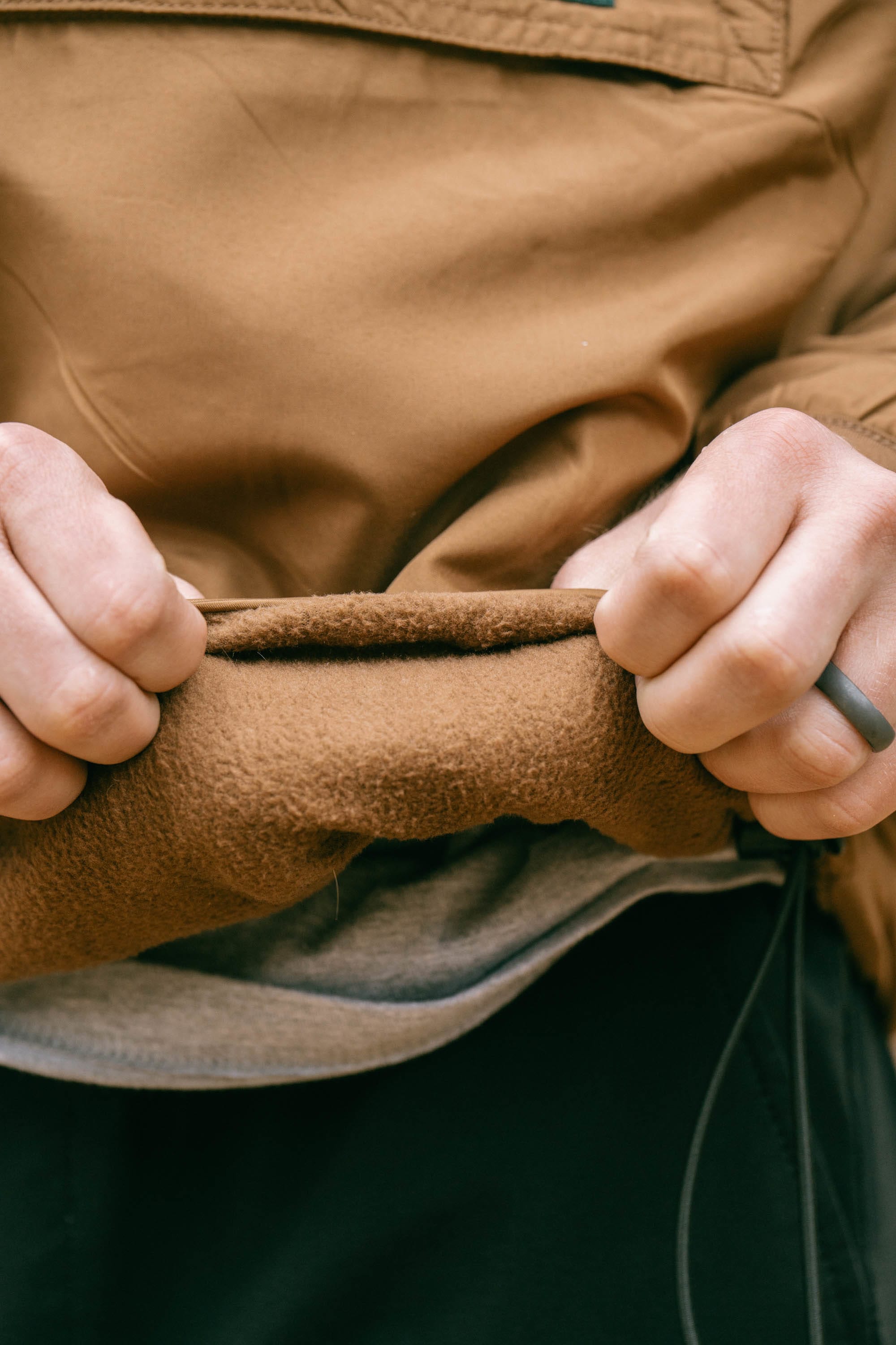Weather-resistant nylon ripstop on one side with the fleece inside could keep you protected from harsher conditions, and fleece on the outside works as an incredible windstopper and showstopper.