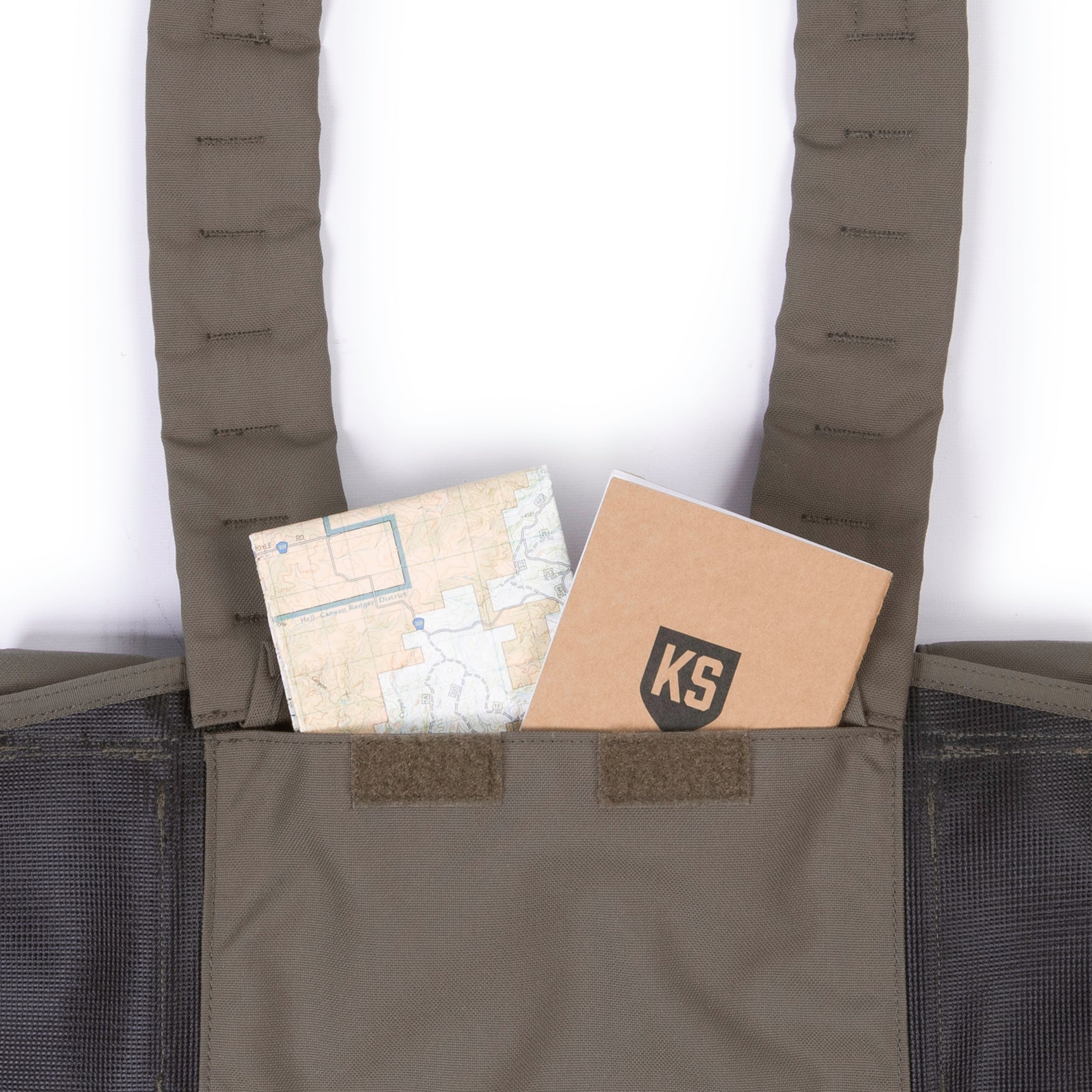This flapped sleeve is accessible while wearing the rig, making it perfect for notebooks & pens, IDs, maps, and other documents.
