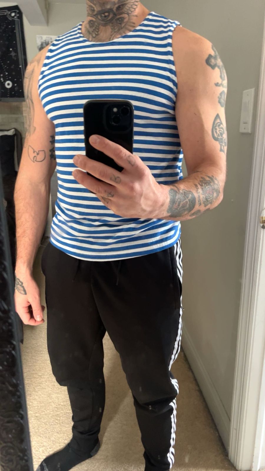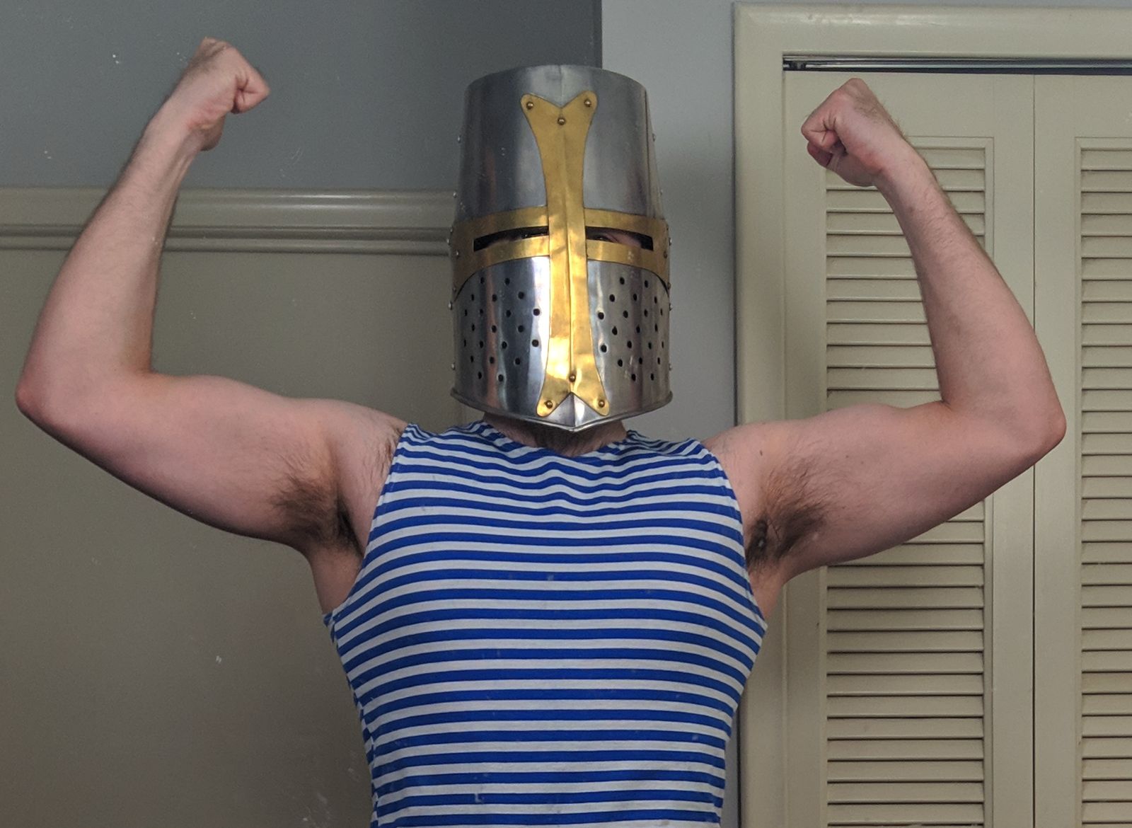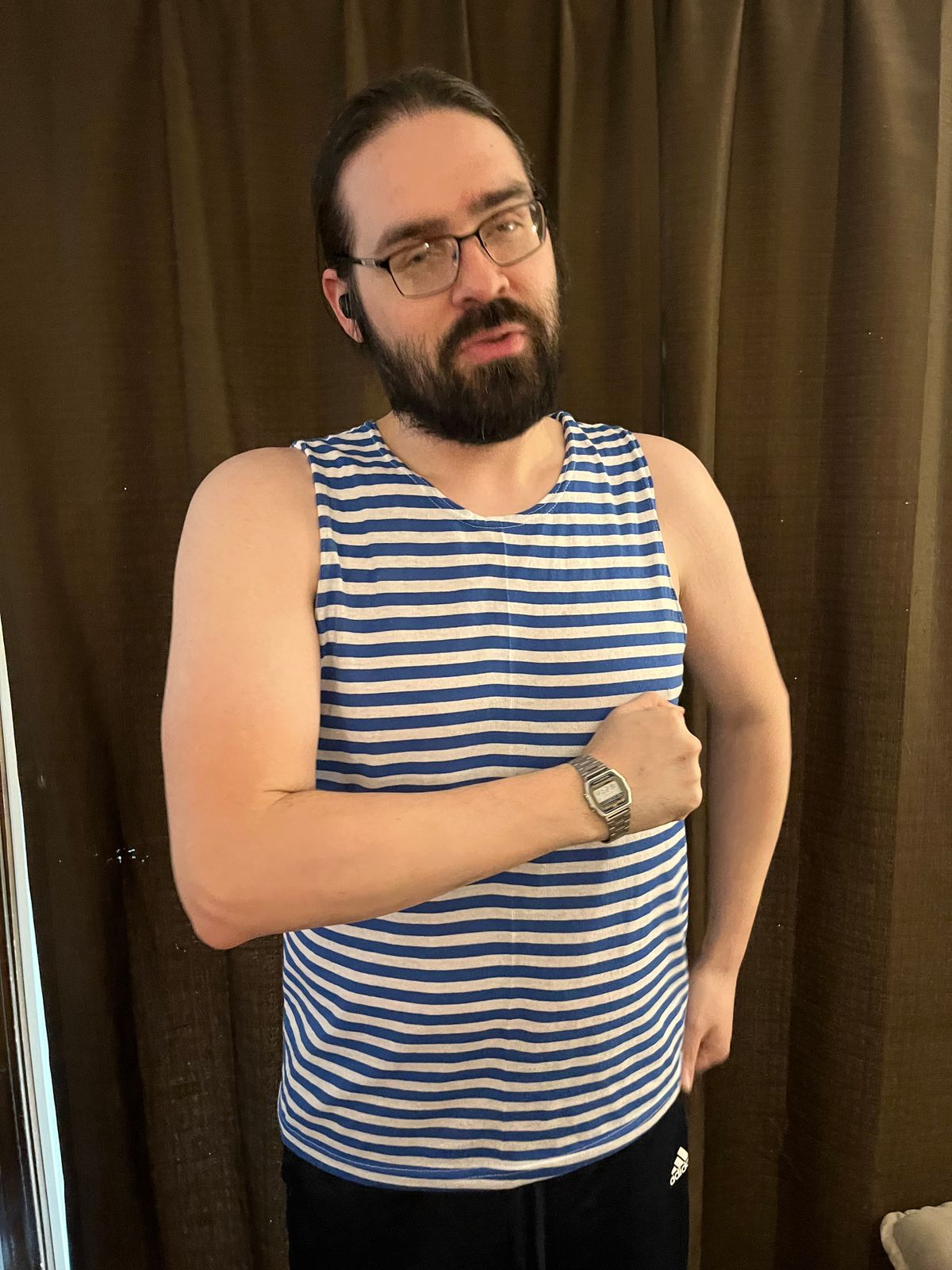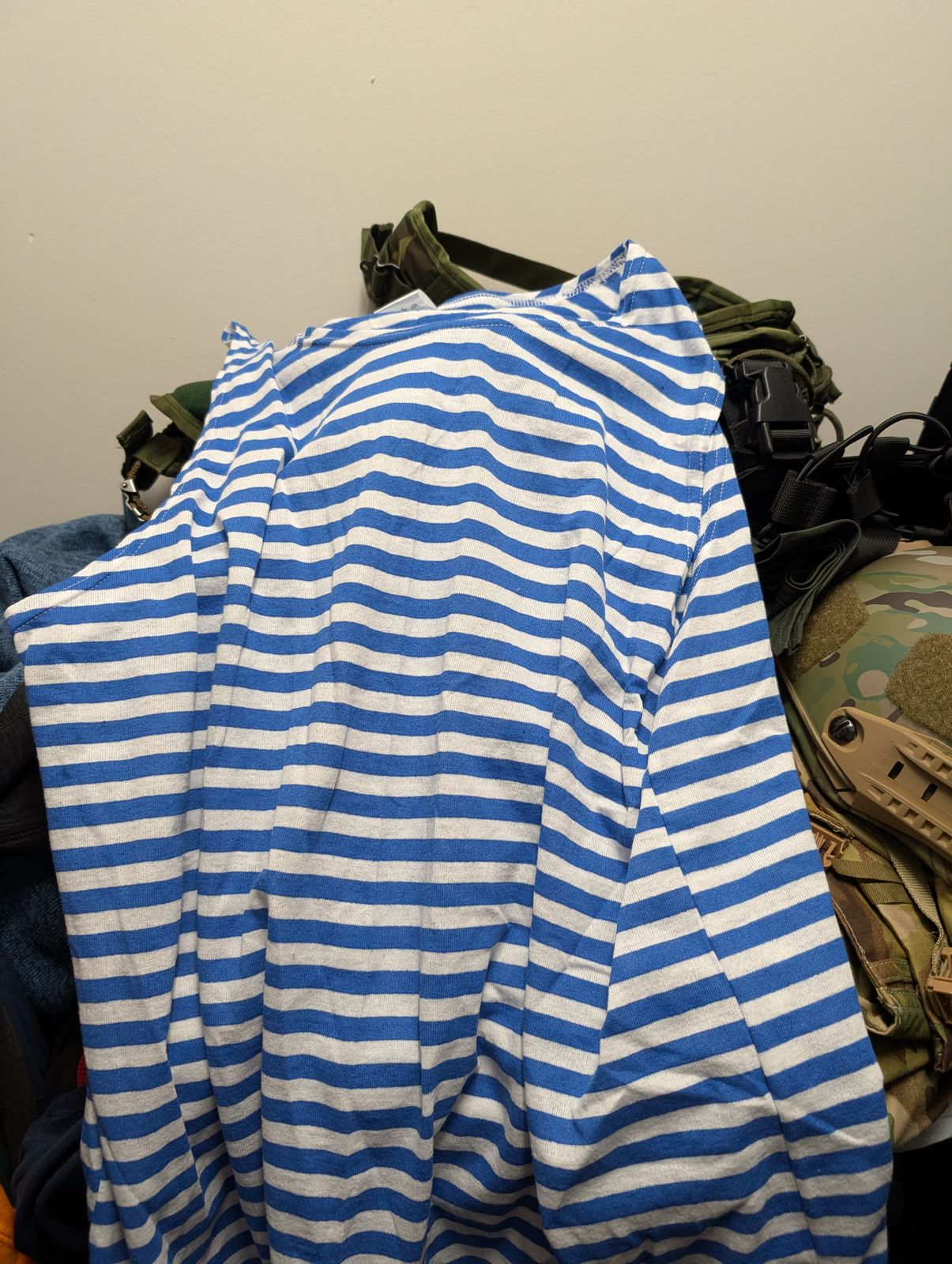 The wide neckline makes the telnyashka quick to don and doff, and legend has it that it’s designed to show off the swole, oily traps of stronk (definitely not malnourished) Soviet sailors.