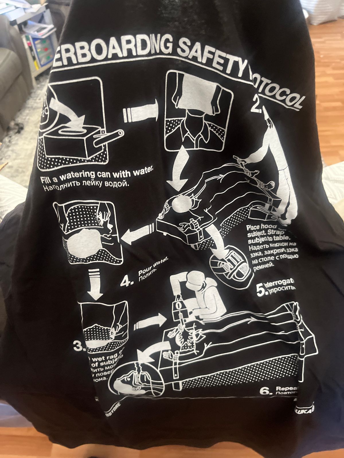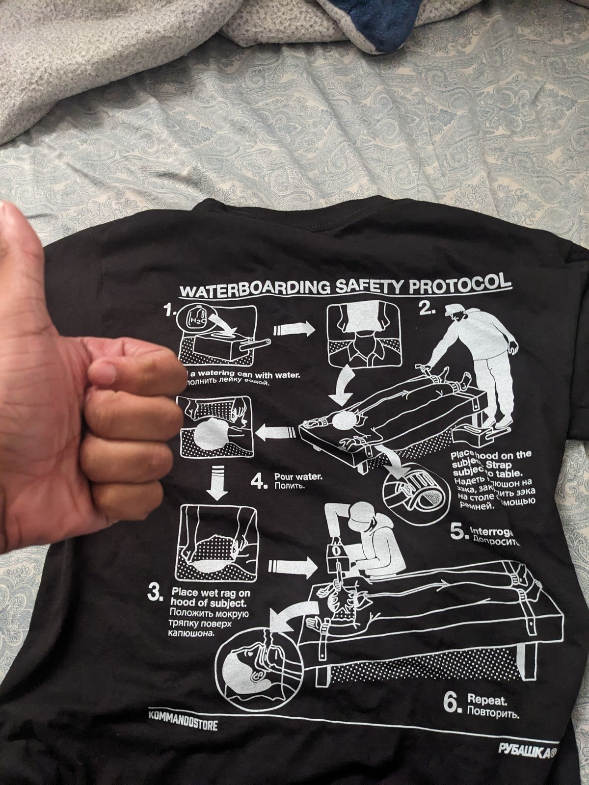 On the back of the shirt, you'll find a high resolution screen-print of the CIA-approved safety protocol diagram we encourage you to study thoroughly. This will boost morale among you and your advanced-interrogating colleagues and ensure you stay hydrated and healthy.