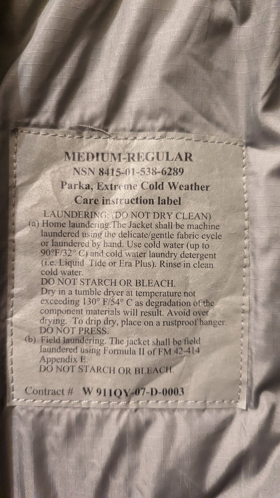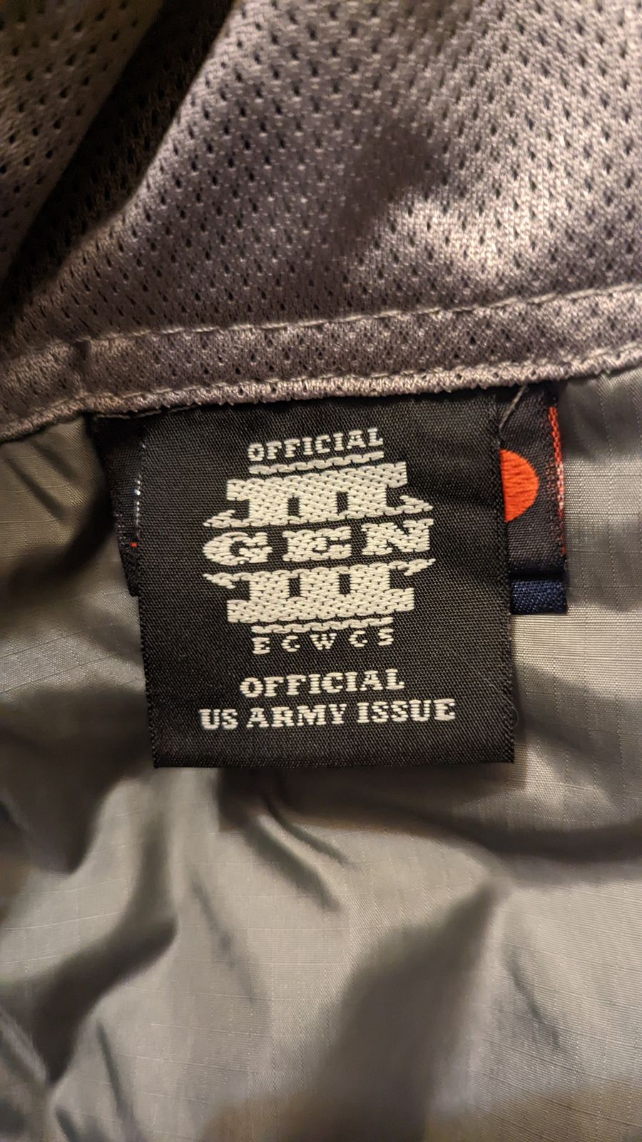 It additionally features nylon reinforced elbows, a hood-hideaway collar, rip-stop inner lining, elastic corded bottom hem, two front zipper pockets and the typical name/rank tapes you'd commonly find on other ECWCS pieces.