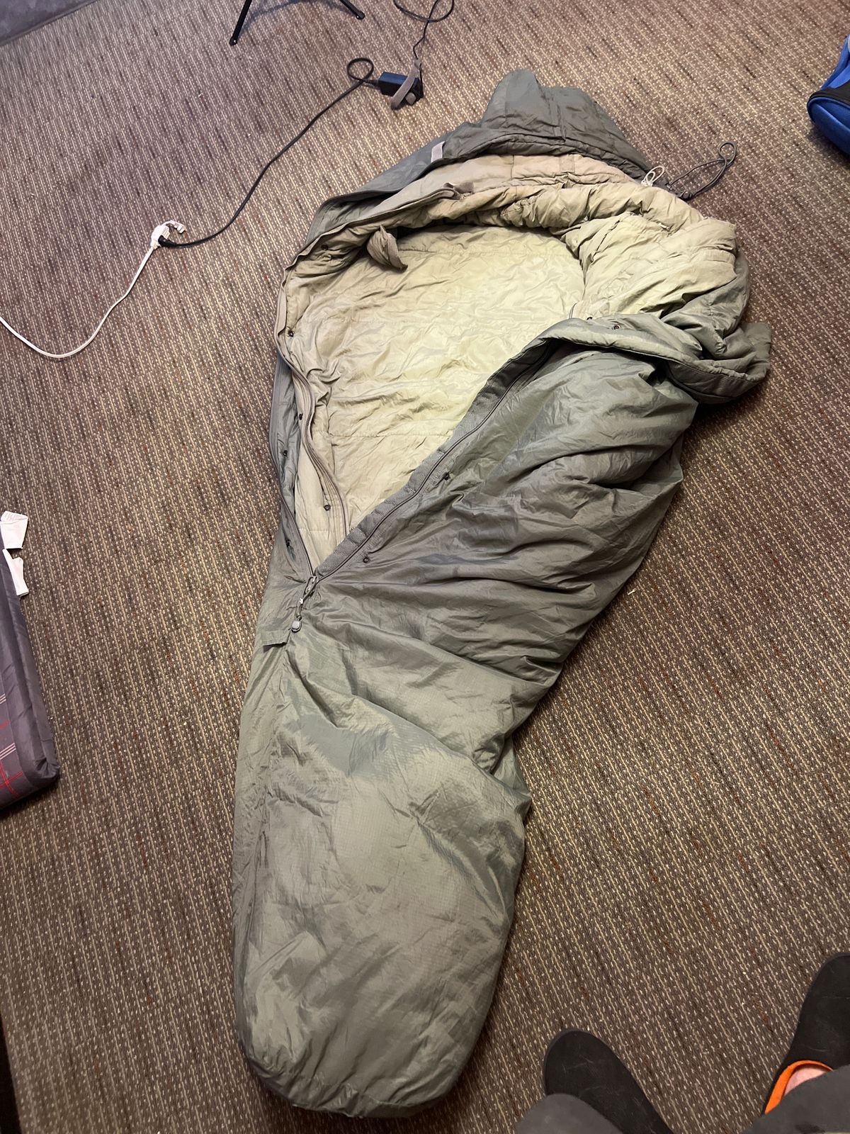 - Join bags by placing the intermediate cold sleeping bag inside the patrol sleeping bag and affixing the two at all attachment points. Use only the patrol sleeping bag zipper to enter and exit. This configuration will protect from -10°F to -50°F when used with the layers of the extended cold weather clothing system (ECWCS)